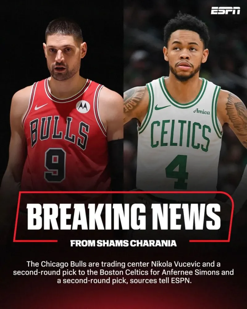 来自名记Shams的报道,凯尔特人和公牛达成了一笔交易,具体细节:——凯尔特人得到武切维奇、2027年次轮(来自掘金)——公牛得到安芬尼西蒙斯、2026年次轮(森林狼/鹈鹕/尼克斯/开拓者顺位最高的那个)由于可能有第三方加入,目前这笔交易还没有官宣,但是从已有的情况来看,史蒂文斯似乎又完成了一笔神操作。首先说下,不管是安芬尼西蒙斯还是武切维奇,两人被交易都不...